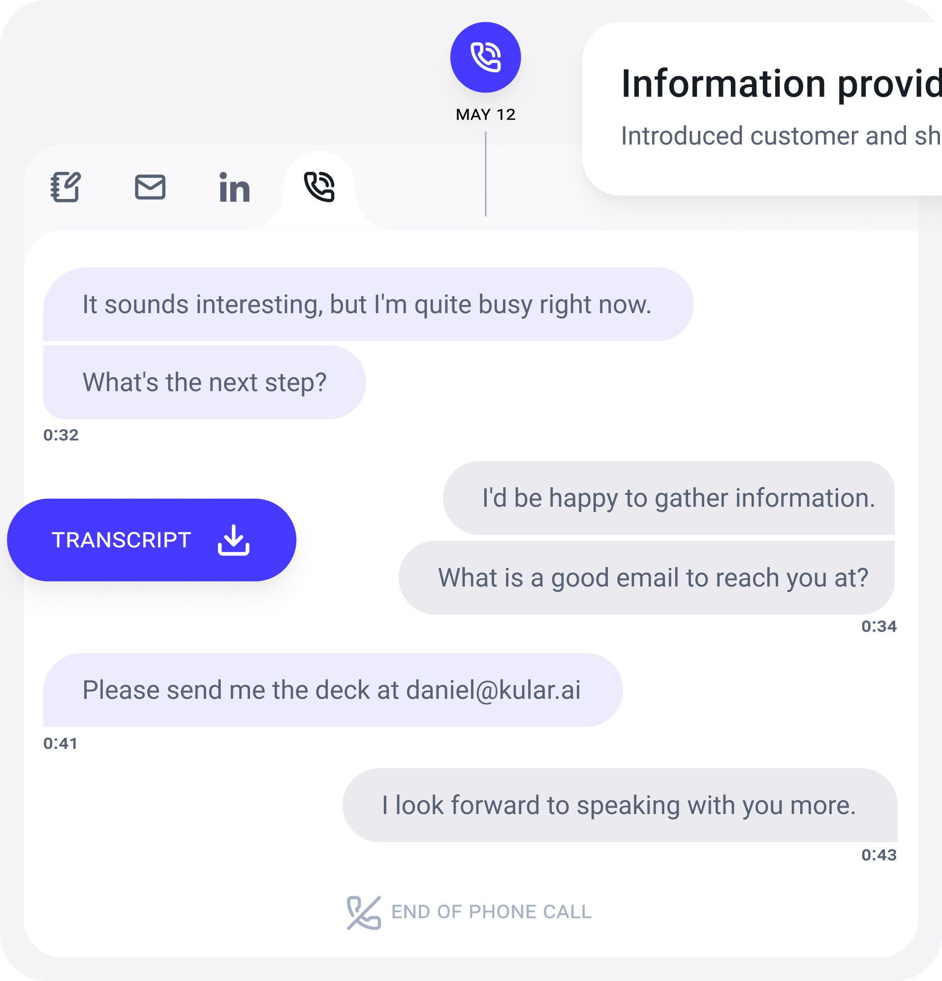 Kular automatically identifies visitors to your website and evaluates whether they’re a good fit for your business before reaching out. You can also clone your voice with AI, letting prospects speak directly with “you” on your site. This ensures irrelevant leads are filtered out while demonstrating that your business is at the forefront of AI.